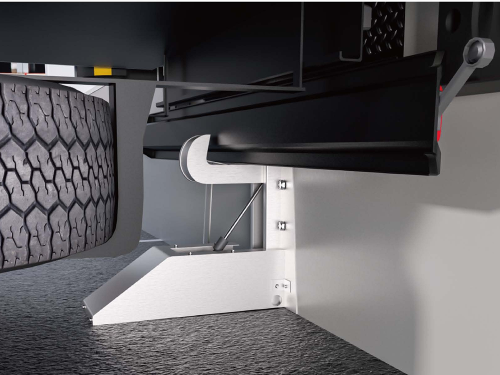 Once the lorry backs to the position of loading / unloading, its tail end will touch and press down the entire steel frame with a built-in spring to allow it to back-up completely against the steel frame. Presses the control button to hoist up the hook and hook the cross-bar of the lorry tail; The hook could bear a force as high as 16,000Kg. Push the locking hook of the car lock up through the oil cylinder, locking the ant-collision rear beam of the carriage,and limiting the movement of the tuck. The locking device will also automatically fix with the cross-bar of the lorry bar during loading and unloading. After the loading or unloading is finished, Press the button again to release the hook. If the lorry deviates from or the cross-bar of the lorry tail isn’t at the effective locking position, the locking device will be under wrong working conditions. Then the alarming device will sound an alarm and warn the operator that the lorry isn’t locked normally.